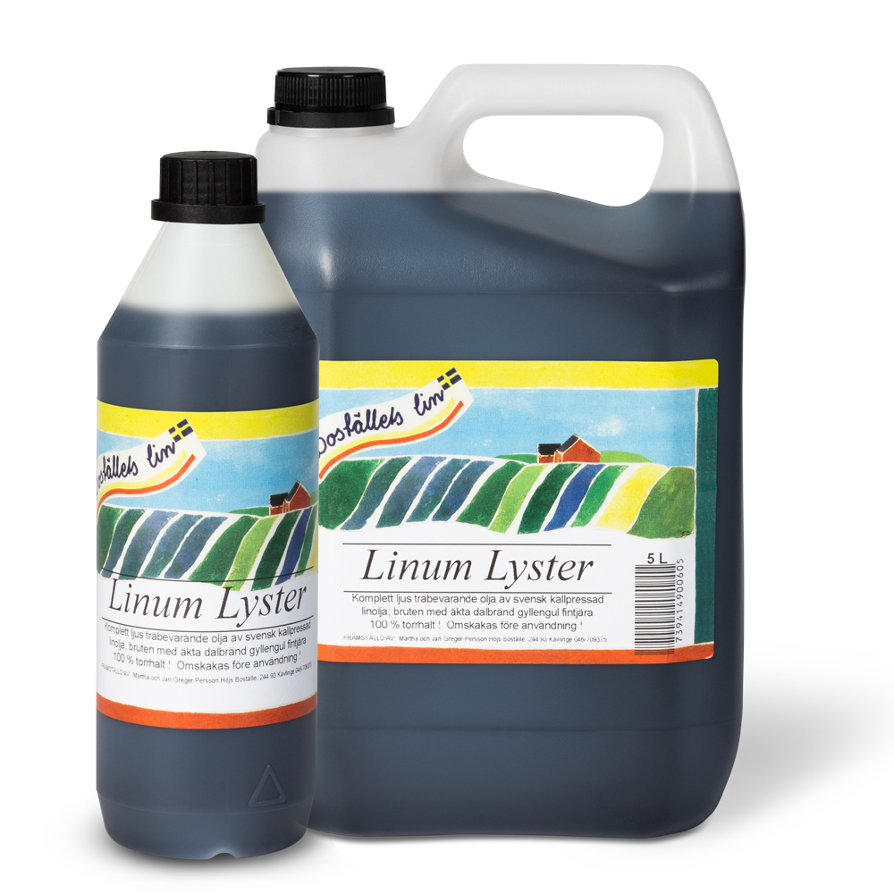 Linum Lyster är det ljusa alternativet av vår roslagsmahogny – en trätjärablandning med både kallpressad rå och kokt linolja, bruten med äkta dalbränd gyllengul fintjära, naturens egna algskydd.